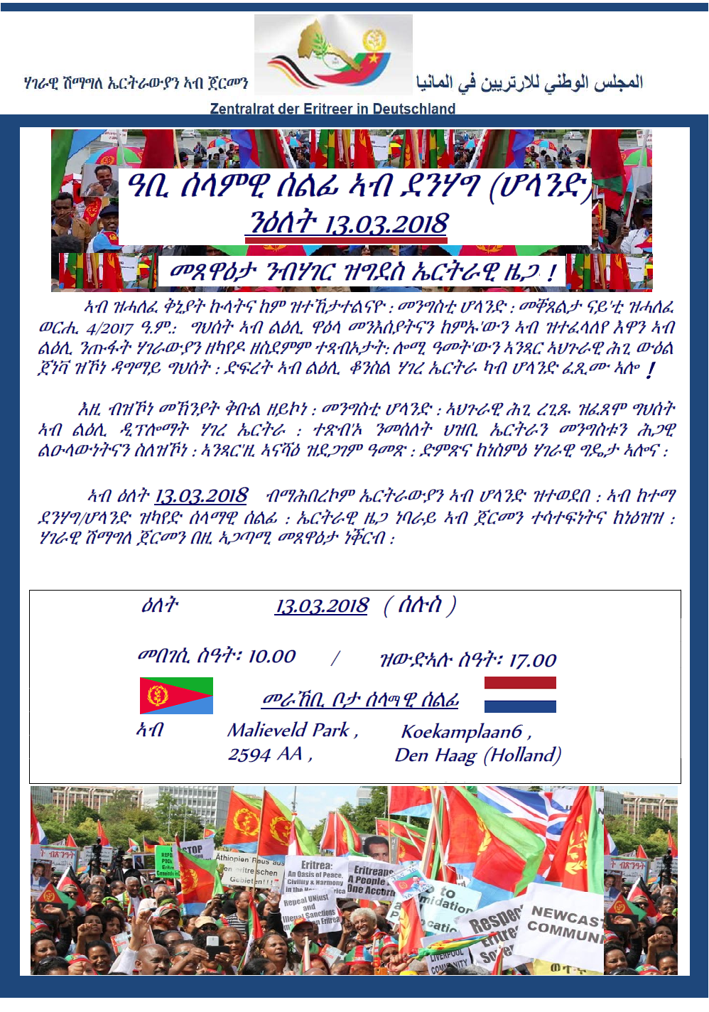 መጸዋዕታ ንብሃገር ዝግደስ ኤርትራዊ ዜጋ ! ዓቢ ሰላምዊ ሰልፊ ኣብ ደንሃግ (ሆላንድ) ንዕለት 13.03.2018