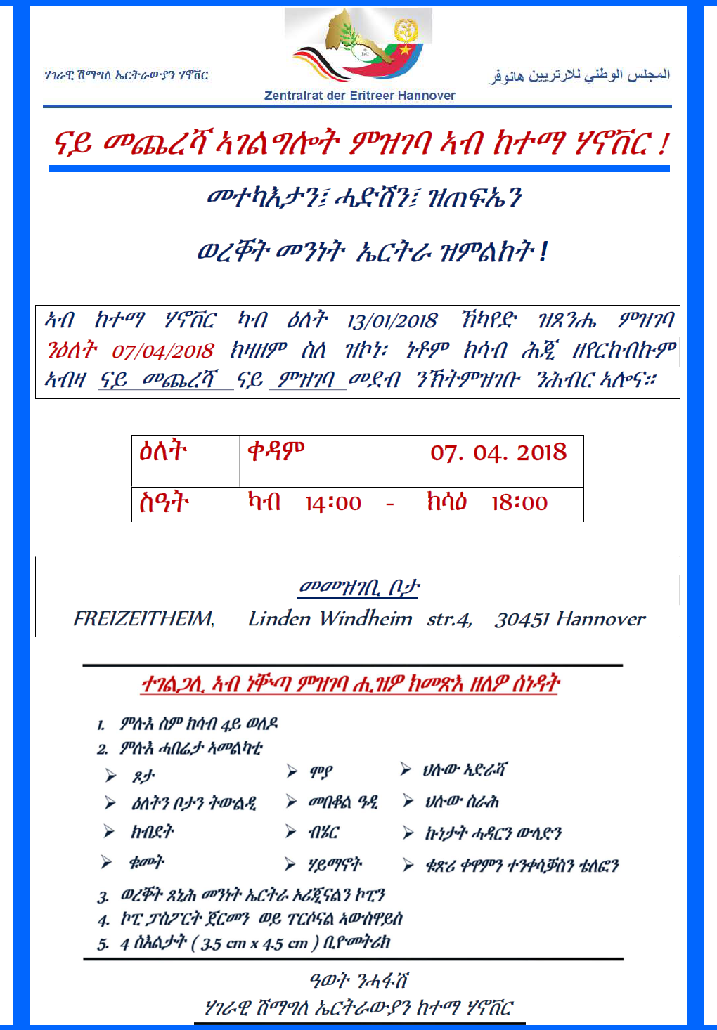 ናይ መጨረሻ ኣገልግሎት ምዝገባ ወረቐት መንነት ኤርትራ ኣብ ከተማ ሃኖቨር ! ንዕለት 07/04/2018 ክዛዘም ስለ ዝኮነ፡ ነቶም ክሳብ ሕጂ ዘየርከብኩም ኣብዛ ናይ መጨረሻ ናይ ምዝገባ መደብ ንኽትምዝገቡ ንሕብር ኣሎና።