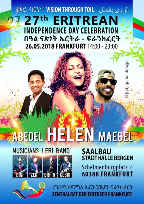 ሃገራዊ በዓል ናጽነት ኤርትራ ኣብ ከተማ ፍራንክፈርት - ዕለት : 26.05.2018 ካብ ስዓት 14.00 – ክሳብ ስዓት 23.00 - ብሃገራዊ ሽማግለ ኤርትራውያን ፍራንክፈርት