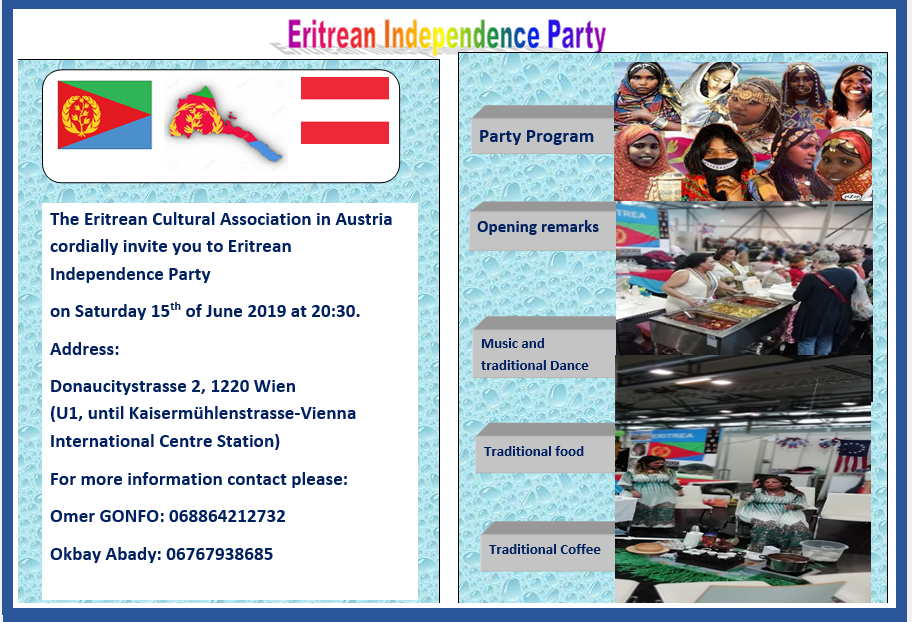 The Eritrean Cultural Association in Austria cordially invite you to Eritrean Independence Party on Saturday 15th of June 2019 in Wien - Austria