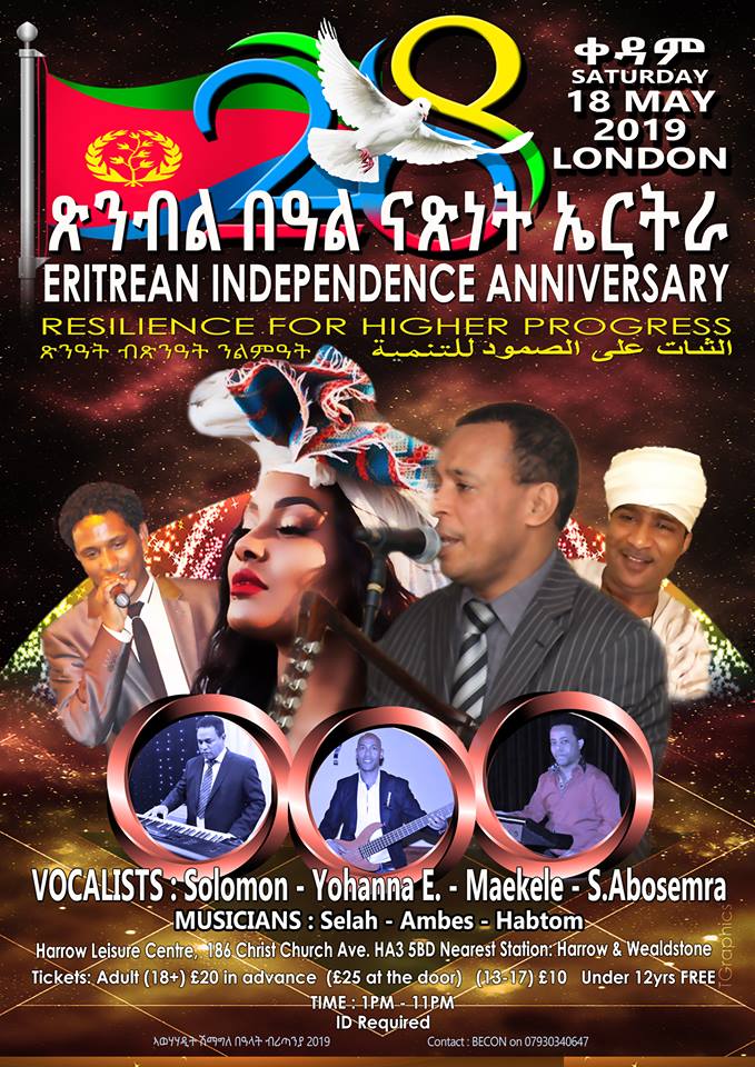 I feel honoured to say that 28th Eritrean Independence Anniversary celebration will be held in different parts of UK in London 18/May/2019, Manchester 25/May/2019, Leeds 18/May/2019, Birmingham 25/May/2019, Sheffield 26/May/2019, Nottingham 25/May/2019, Coventry 25/May/2019, Liverpool, and Newcastle 25/May/2019.