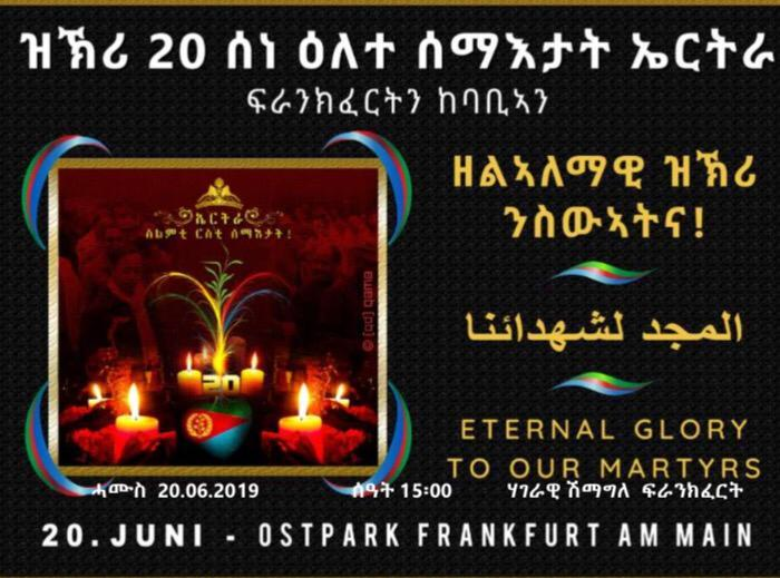 20 ሰነ መዓልቲ ሰማእታት ኤርትራ ኣብ ከተማ ፍራንክፈርት ንዕለት 20-06-2019 ስዓት 15.00