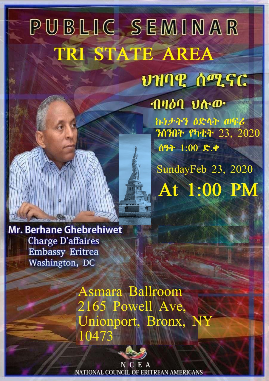 Re- Public Seminar by Berhane Ghebrehiwet Charge D'Affaires Embassy Eritrea Washington, DC to Tri-State area for Sunday Feb 23, 2020 at 1:00 PM.
