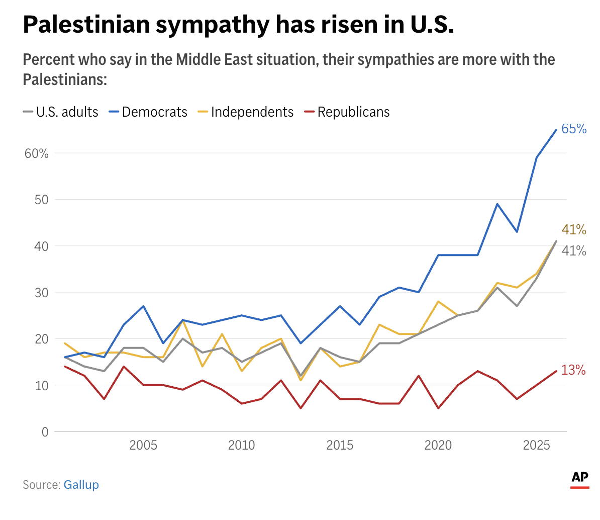 Democrats’ support for Palestinians rose from a low in 2013 of 19%, to a high today of 65% (3.42 times what it had been), while Republicans’ rose from 5% then, to 13% today (2.6 times what it had been). Among independents, it was 12% then and is 41% now (3.42 times what it had been — the exact same rise as among Democrats).